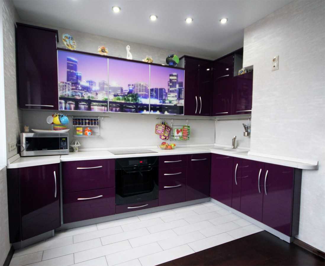 Не стоит приобретать комплекты мебели цвета баклажан с дополнительными декоративными изображениями на фасадах, особенно если они глянцевые. Это перенасытит помещение и сделает его слишком пестрым