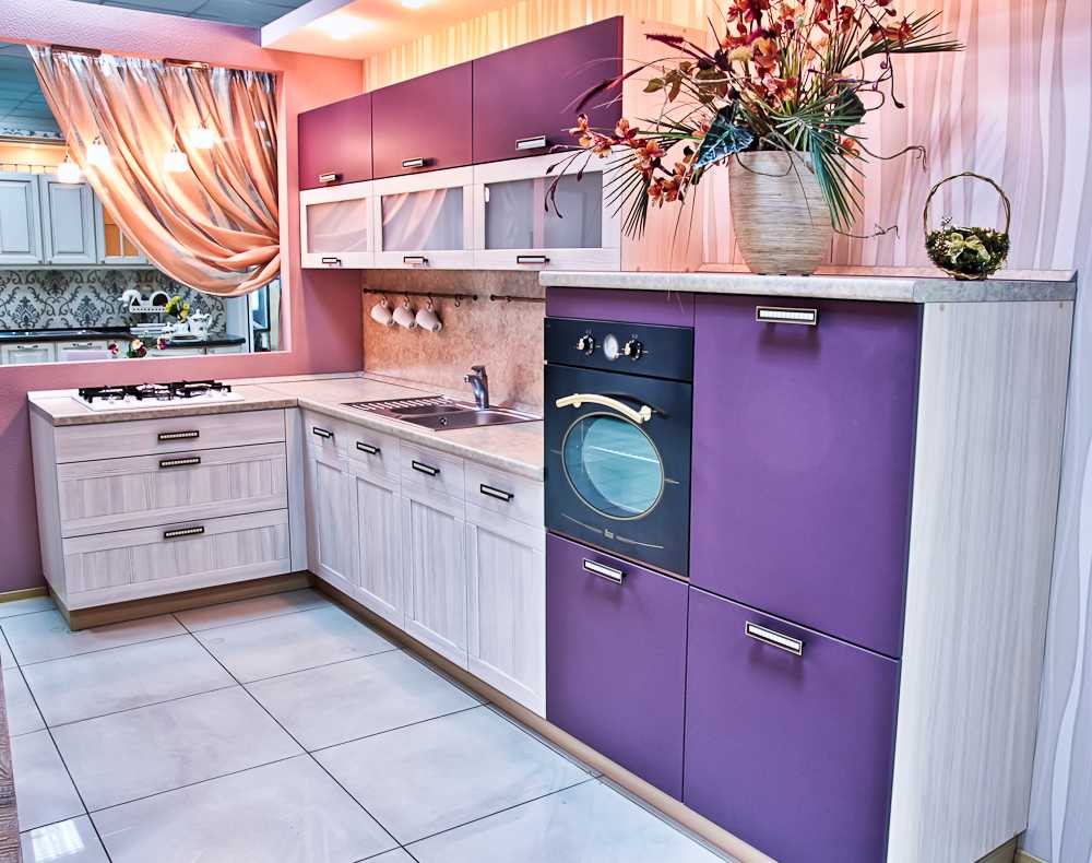 Если кухня отличается простором, то здесь есть поле для фантазии. Так, к примеру, на ней может быть установлена кухня угловая баклажан с белым. Дополнить ее можно островом с рабочей зоной или мойкой на поверхности. Обеденная зона, в свою очередь, располагается в отдельном месте кухни, которое выделено цветом или фактурой отделки.