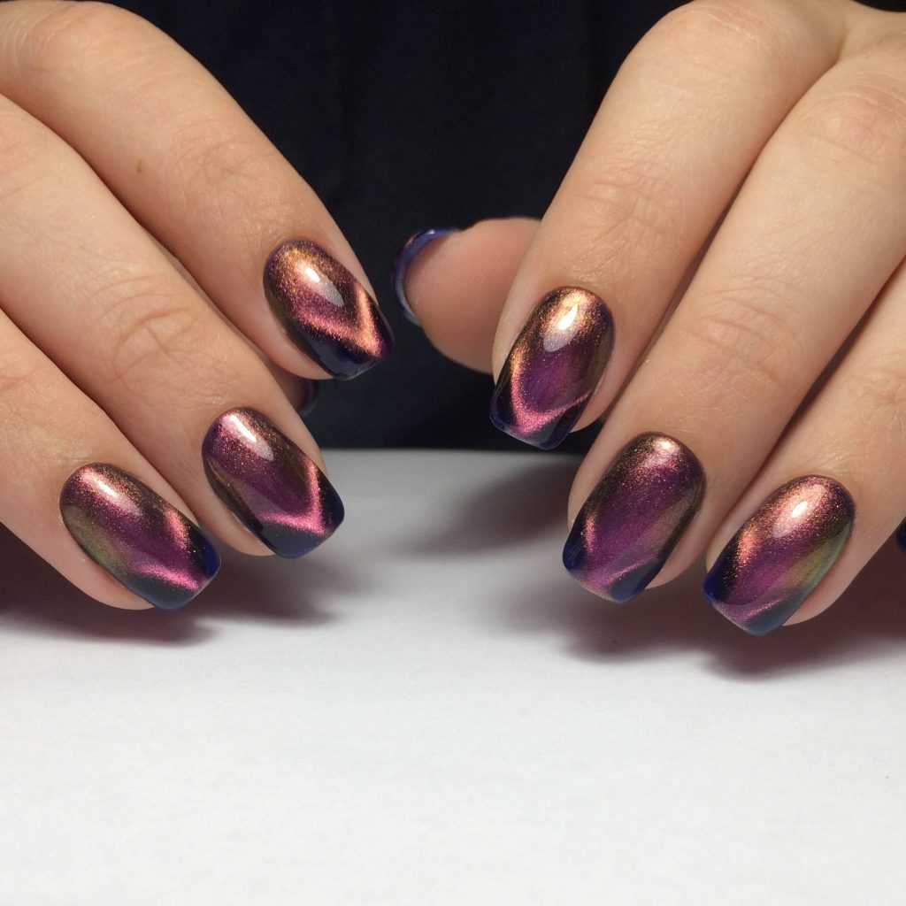 Несмотря на то, что смысл магнитного лака заключается в создании оригинальных переливов и игры цвета, он отлично смотрится и в матовом варианте. При этом без глянцевого блеска можно оставить только несколько или все ноготки.