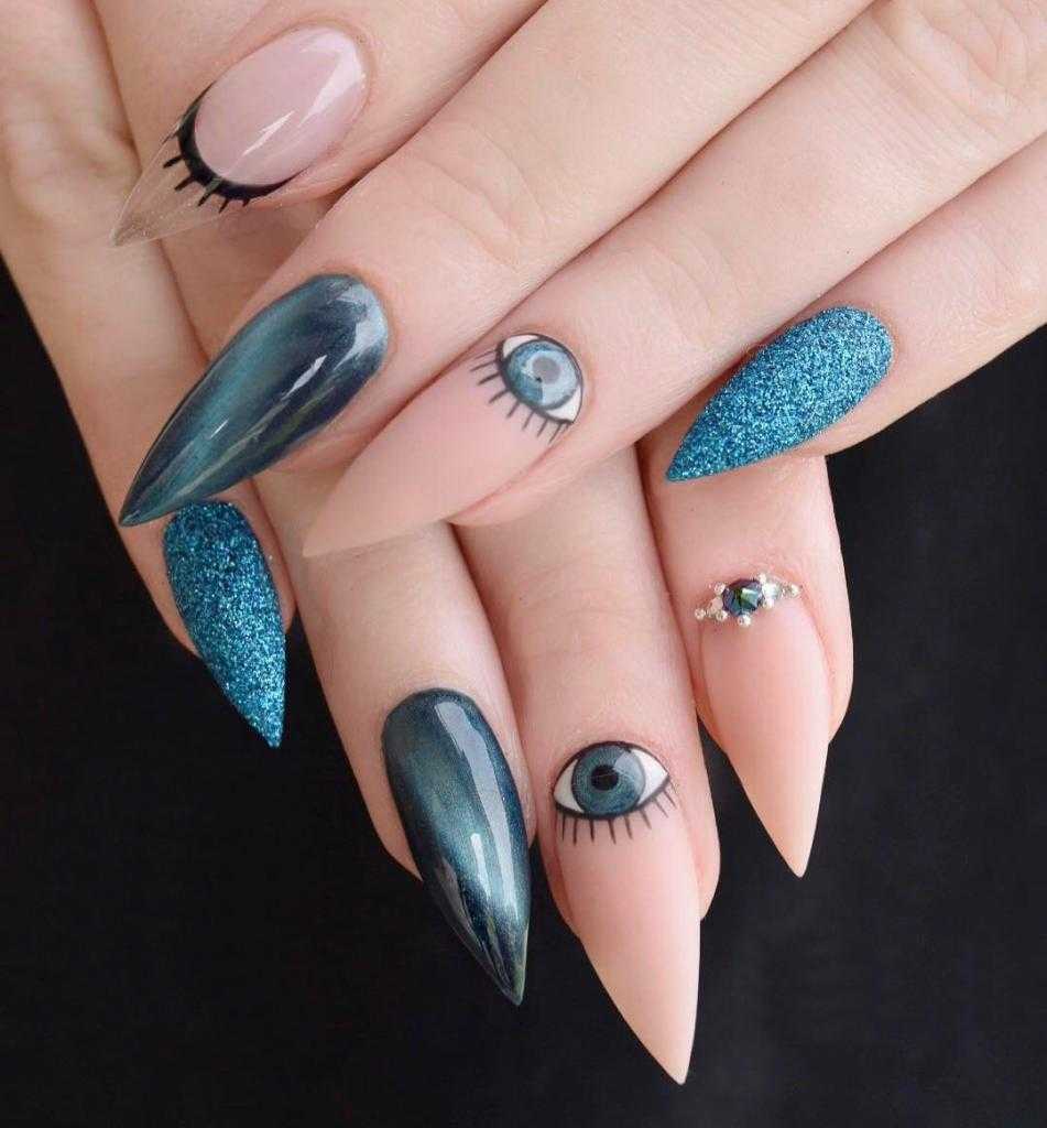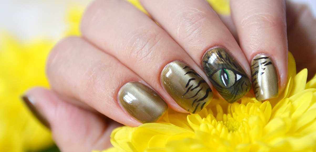 Интересный и оригинальный вариант получается при комбинации в одном маникюре сразу нескольких интерпретаций «кошачьих глаз».