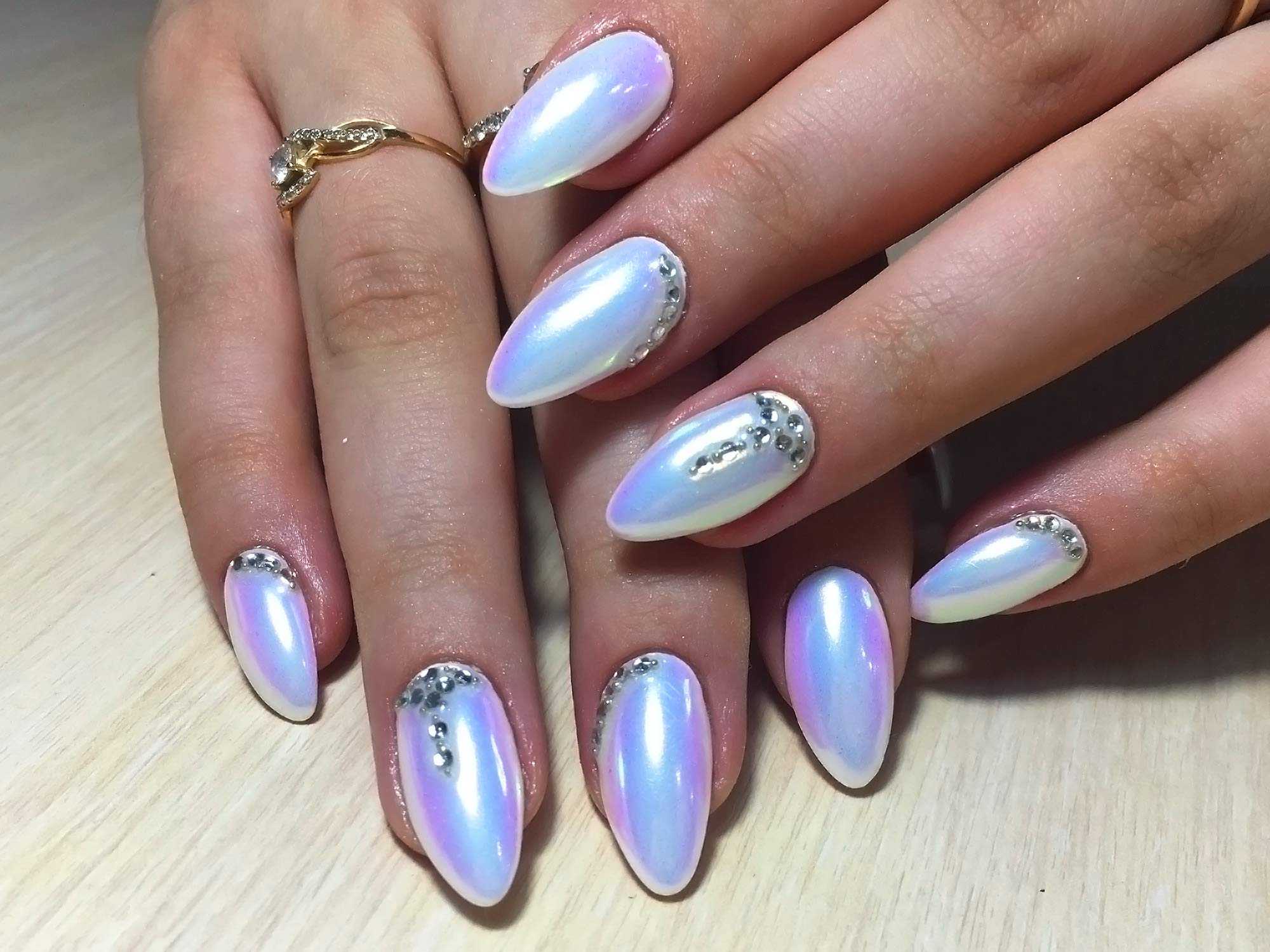 За основу можно взять любую светлую палитру, ведь стразы прекрасно дополнят ноготки любого цвета. Украсить можно один пальчик, обильно покрыв его блестками, или же аккуратно декорировать все.