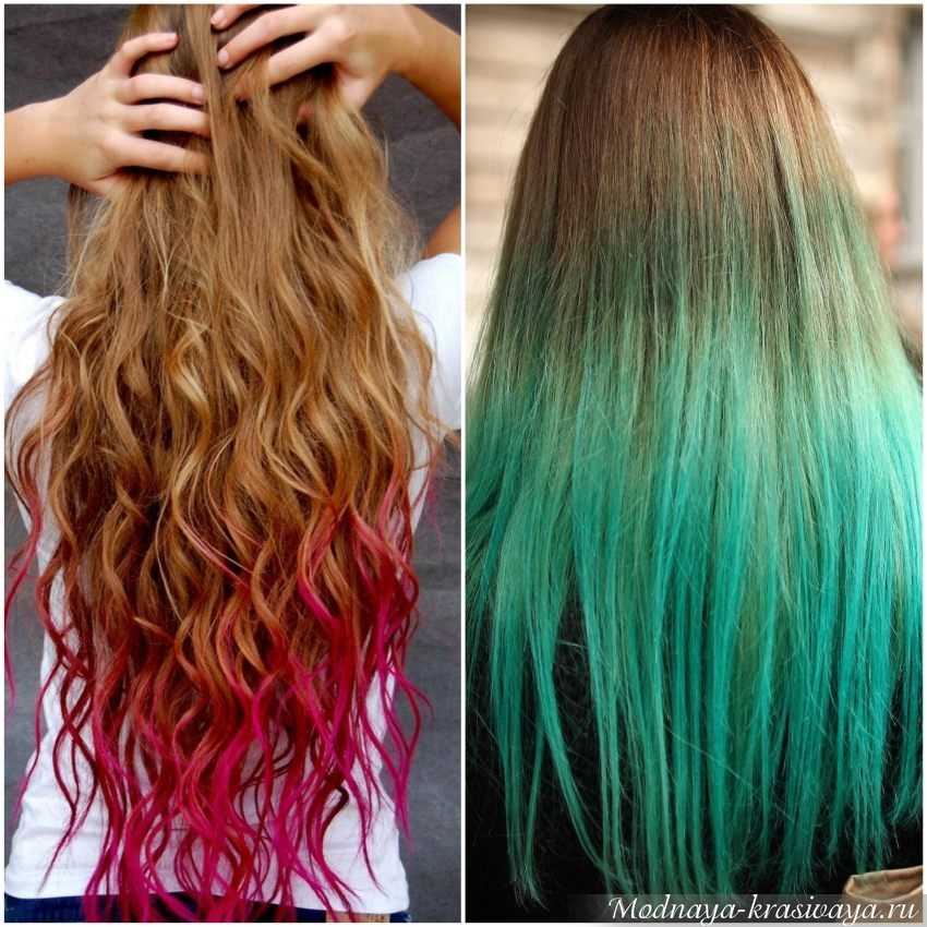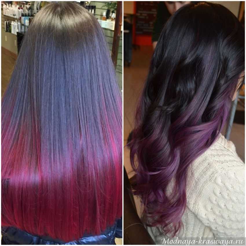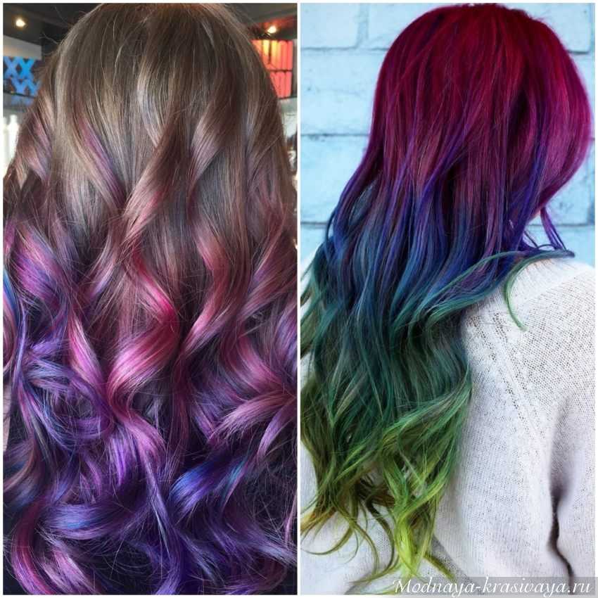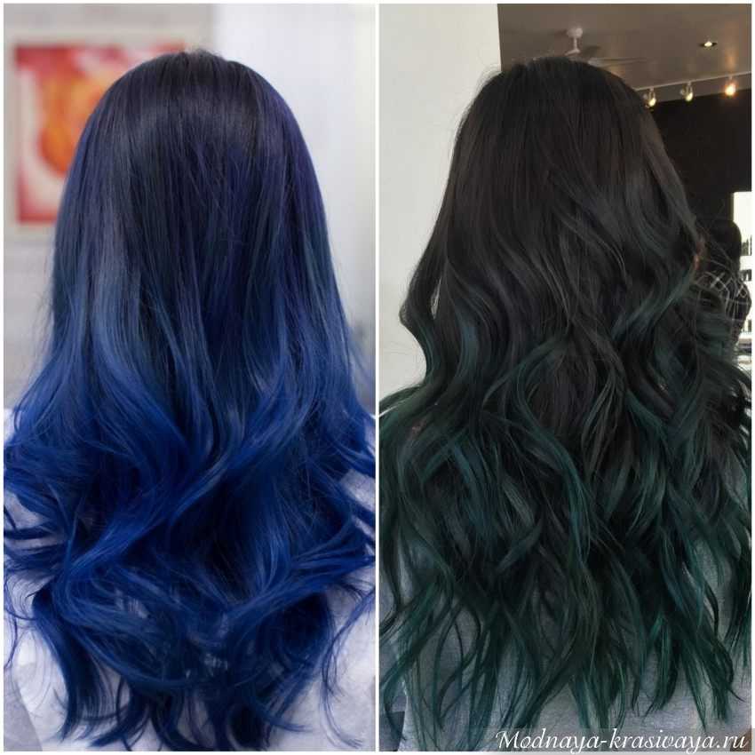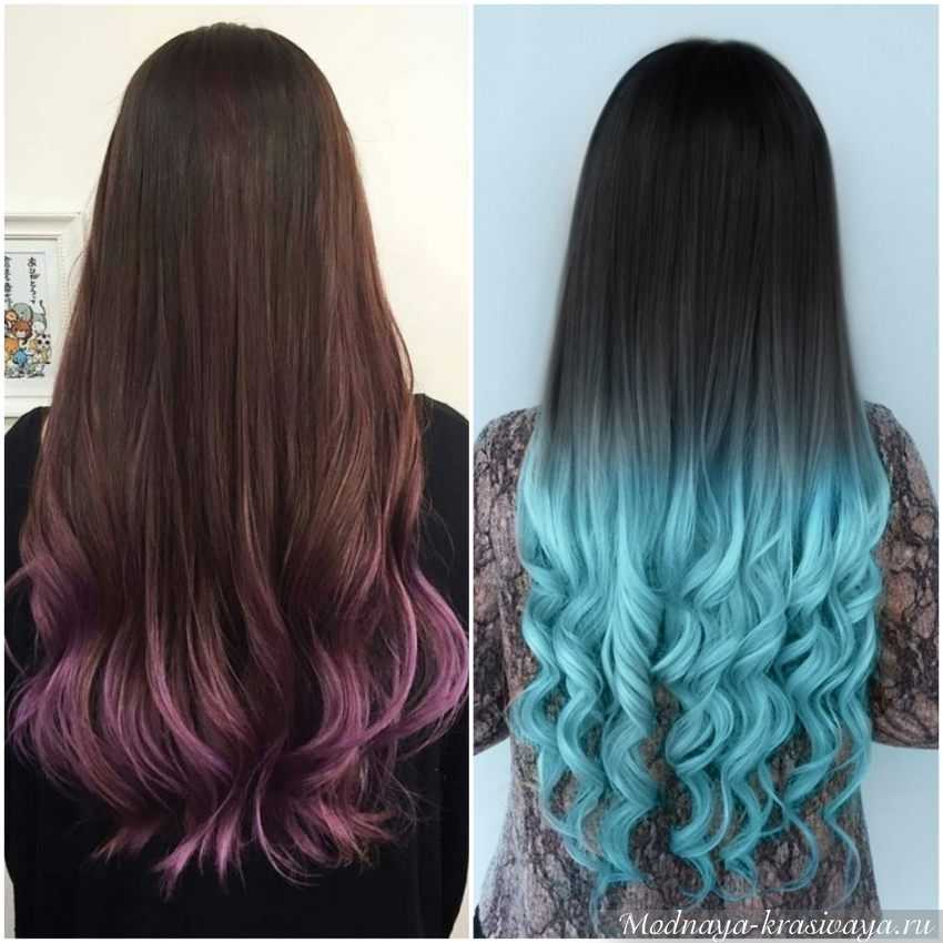 Изменить имидж поможет цветное омбре. При этом используются разные яркие переходы. При этом натуральные оттенки каштанового и черного сочетаются с оттенками розовой и синей палитры. Рассмотрим самые популярные виды: