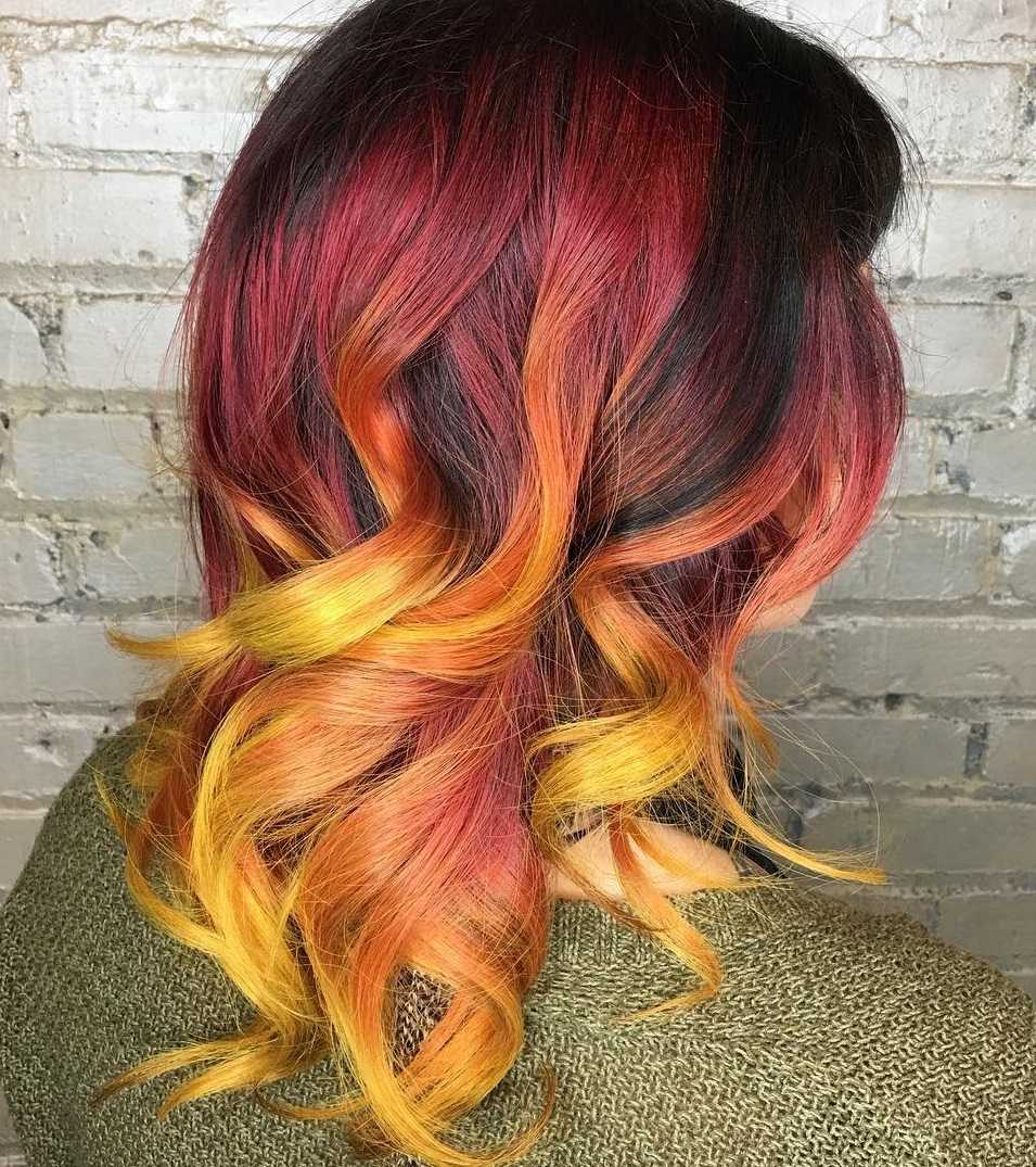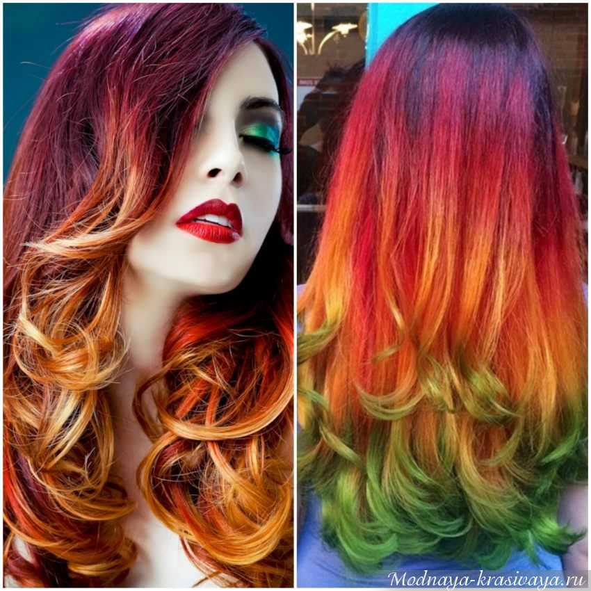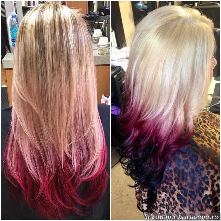 . При этом в алые оттенки красятся кончики волос. При этом граница переходов не должна быть выше скул. Такие волосы смотрятся объемно и придают чертам лица выразительности.
