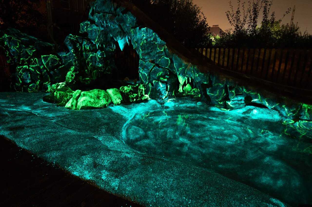 Неоновую краску в баллончиках для камня изобрели ландшафтные дизайнеры. Прозрачный слой добавляет красок в вечерний пейзаж. Можно сделать светящийся вариант бордюров, добавить света в оформление рокариев. Люминофор способен светиться с легким затуханием до 12 часов. В южных регионах, где темнеет рано, светоизлучающие краски – идеальный вариант для деревянных изгородей, садовой мебели, легких беседок. Можно выделить оконные рамы, контуры дорожек.