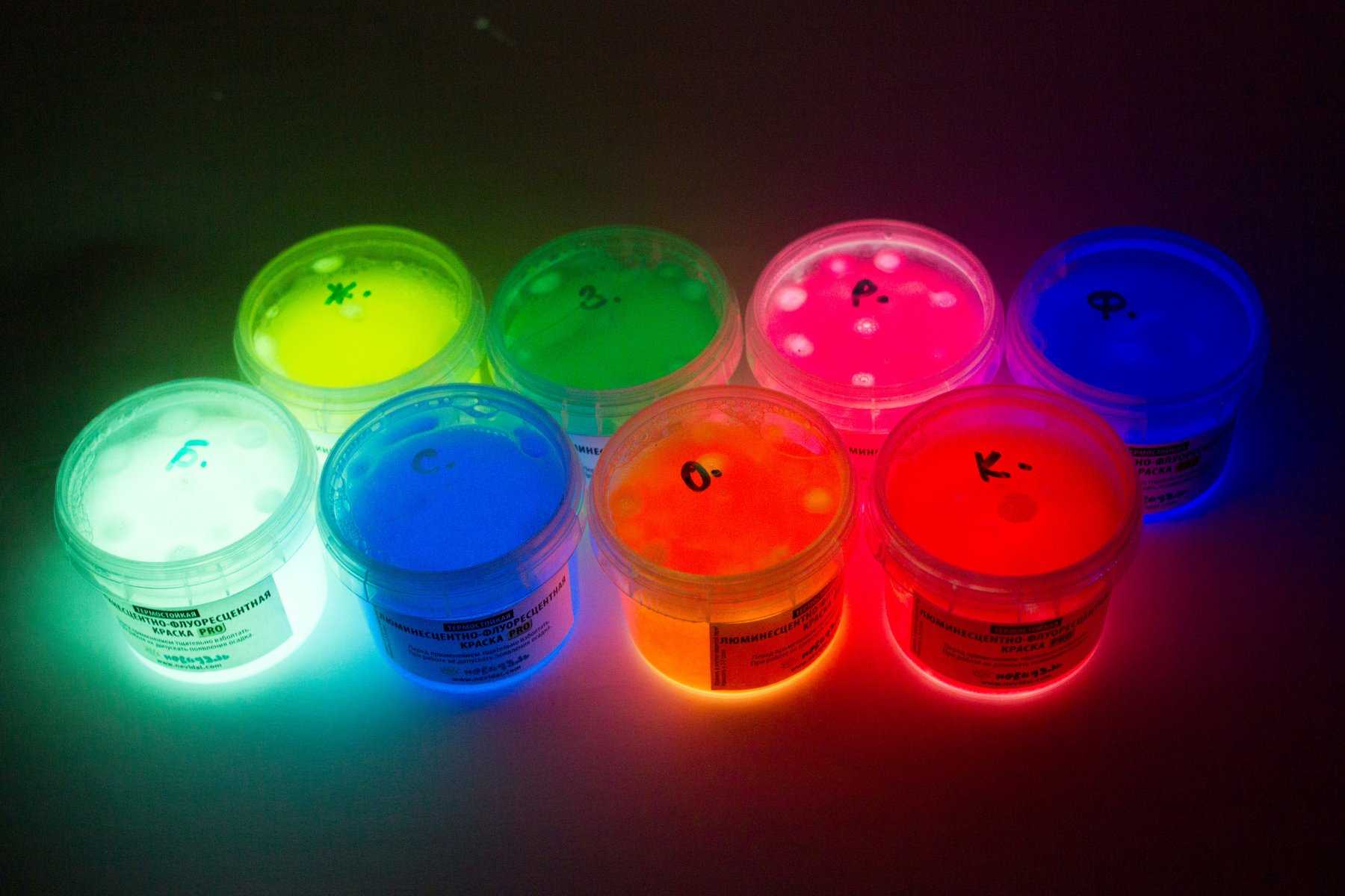 Люминесцентная субстанция имеет большую гамму оттенков, а 100 грамм вещества достаточно, чтобы заправить краски на 8 м².