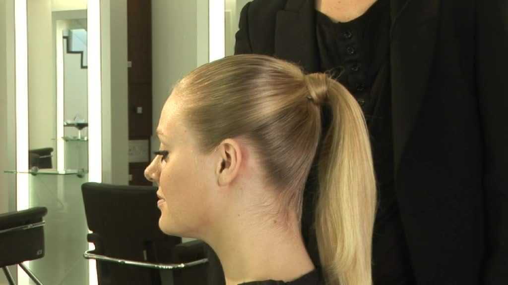 Ярко и эффектно выглядит гладко зачесанный конский хвост. Для этого волосы собираются на макушке и завязываются силиконовой резинкой. Вытянутой прядью закручивается основание хвоста.