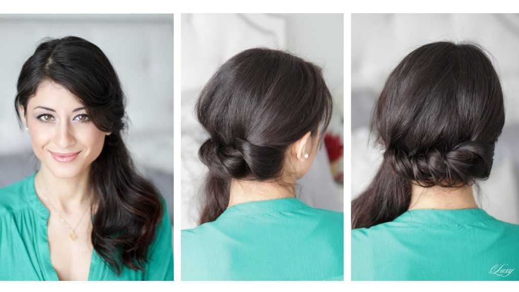 - Меньшую часть волос собрать в слабый хвост сбоку;