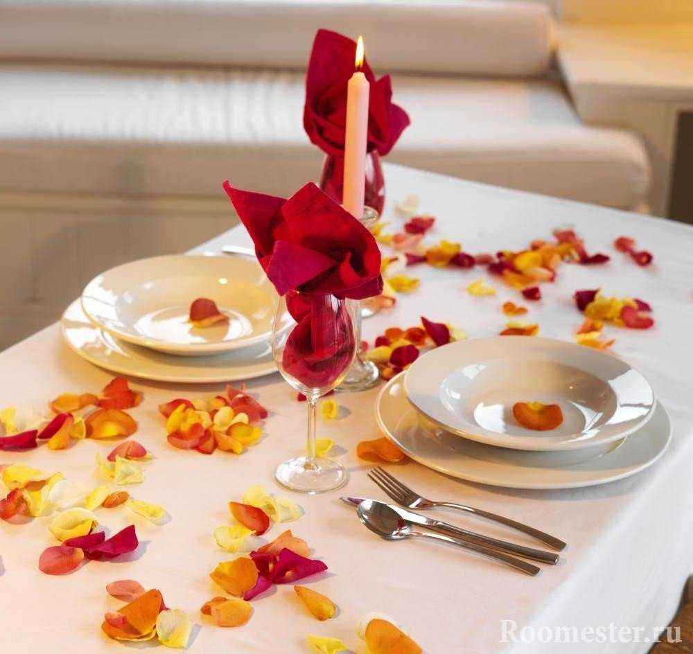 Подберите подходящие по стилю салфетки, их можно положить под тарелки или рядом с ними. Салфетки сворачивают разными способами, но традиционный метод смотрится изящнее. Дополнительно перевяжите свертки лентами по тону скатерти, прикрепите живую розочку – такое исполнение выглядит очень оригинально.