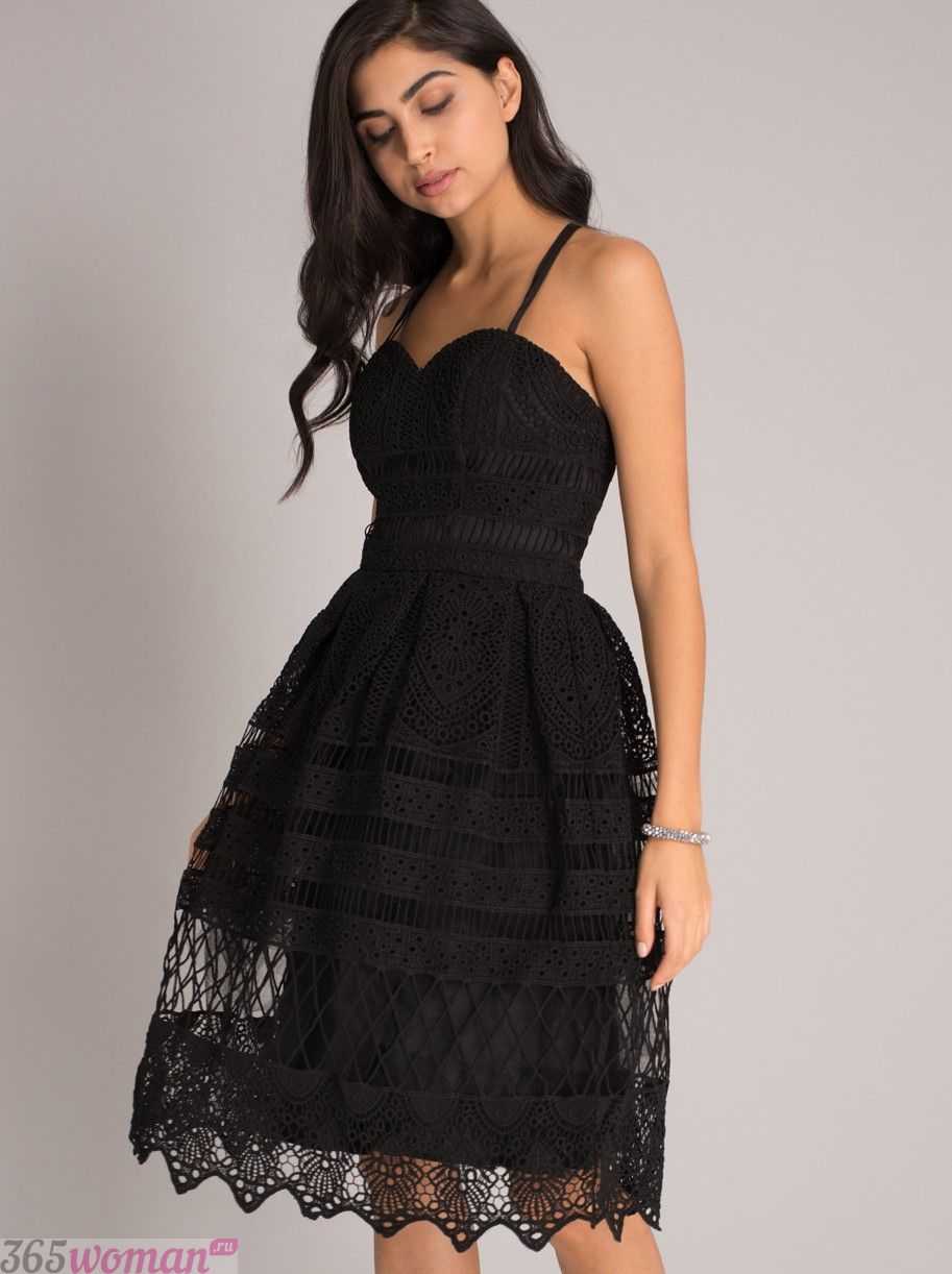 - Коротенькое платье-комбинация с ажурной вышивкой отлично смотрится с черными туфлями с завязками на лодыжке;