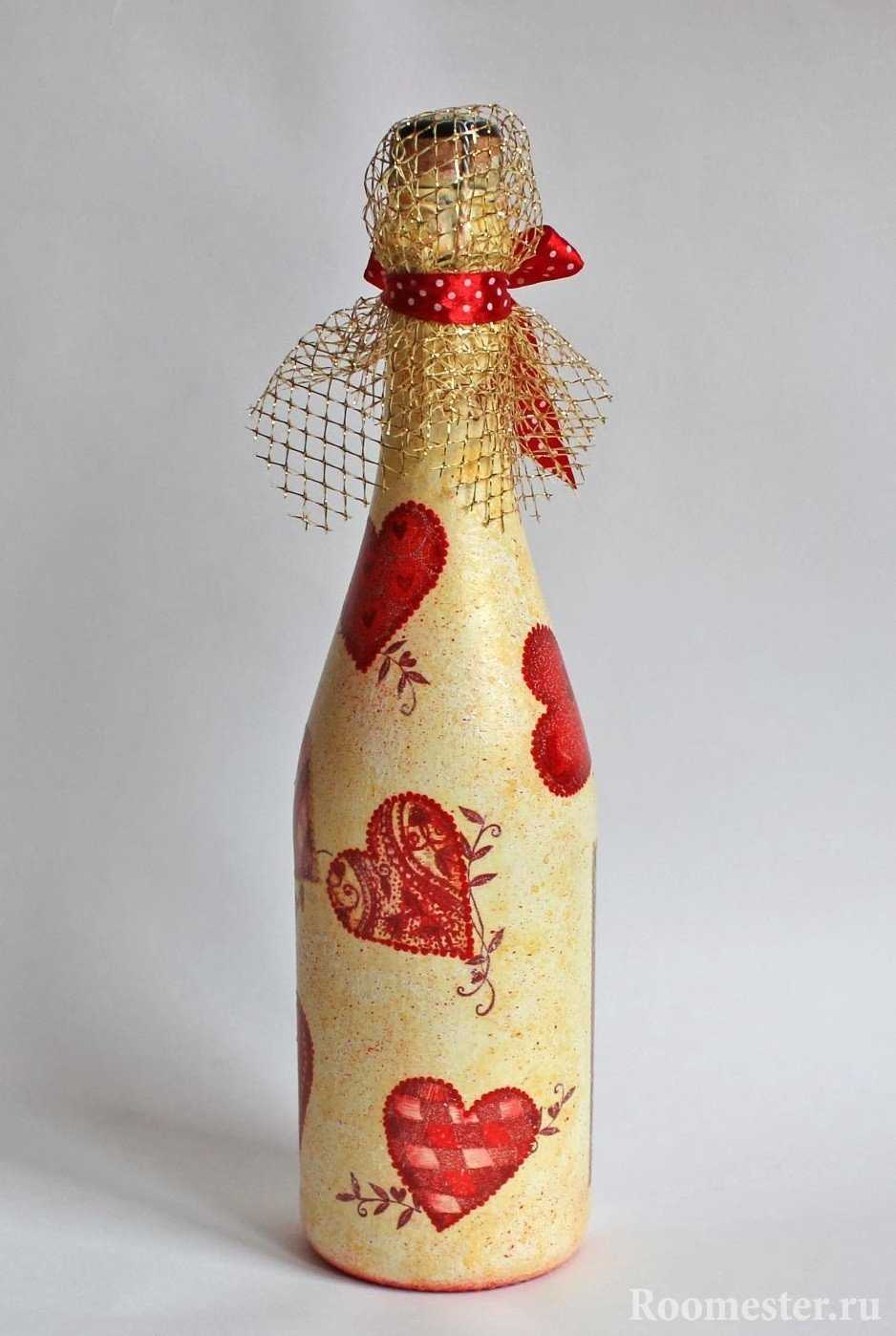 - 2 способ – необычный метод украшения, который приведет в восторг всех присутствующих за праздничным столом. Очищенную бутылку обмажьте кисточкой растопленным шоколадом, наложите несколько слоев. После чего обсыпьте полностью ее орехами, конфитюром — сердечками. Горлышко бутылке оставьте в первозданном виде, чтобы было удобно наливать напитки.