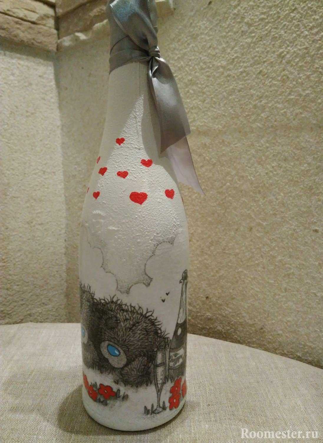 - 1 способ: покрасьте специальными красками емкость белым цветом, подождите, пока краска обсохнет. Вырежьте из любого материала (бумаги, ткани, фольги) сердечки, наклейте их хаотично. Промежутки между вырезками аккуратно прокрасьте розовым или персиковым цветом. Дополнительно приклейте блестки, стразы, бисер. Можно прикрепить к бутылке объемную аппликацию.