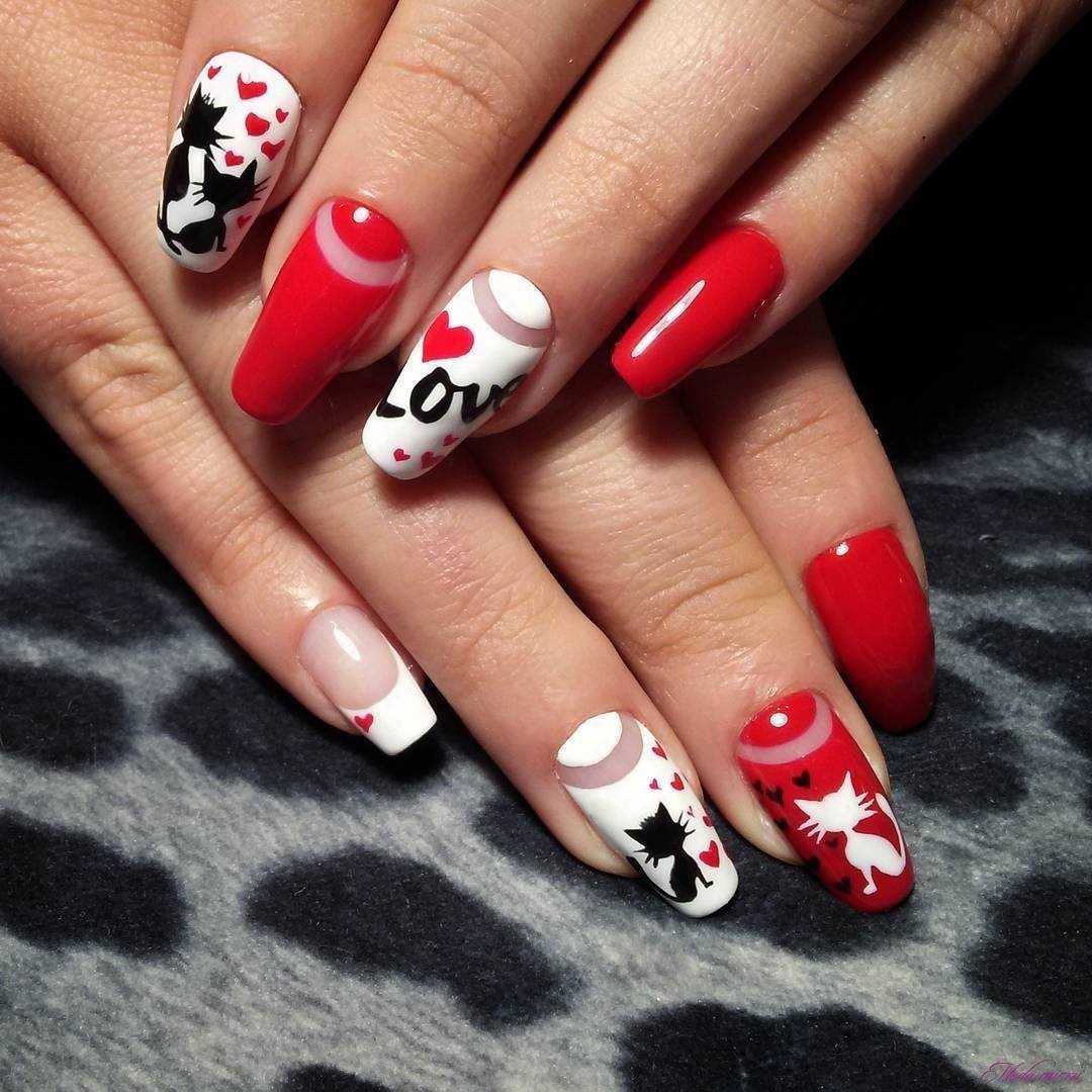 День влюблённых нельзя представить себе без главного символа всех влюблённых – сердца, и традиционных цветовых решений – красного и розового. Сердечный маникюр, выполненный в красно – розовом цвете, можно отнести к одному из самых популярных и модных вариантов. Красивым получится маникюр с использованием оригинальных цветов лака, например, сиреневого, голубого и золотистого. Отдайте также предпочтение белому и бежевому оттенку. Из более тёмных очень эффектны — фиолетовый и бардовый. Помимо различных тематических рисунков, станут невероятно популярны в этом сезоне надписи на ногтях. Всегда занимает высокие места в лидерстве новинок классический френч. Для декора можно использовать блёстки и стразы. Форма ногтей также должна вписываться в ваш романтический образ, и не выглядеть вызывающе. Мы подобрали для вас самые актуальные модные новинки этого праздничного маникюра.