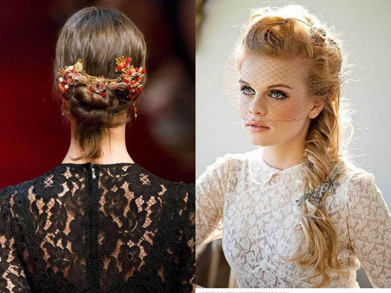 В косу могут быть вплетены искусственные мелкие цветки, ее можно украсить заколками со стразами. Декоративные аксессуары для волос будут уместны на высоких и низких прическах, если правильно подобрать их к наряду. Использование праздничных аксессуаров для волос обеспечивает создание яркого индивидуального образа.