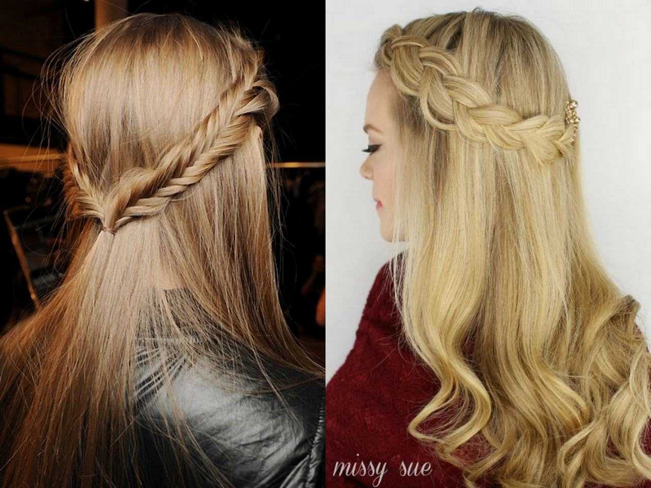 плетения с локонами средней длины очень разнообразны; можно выбрать «французские косы»; закрепить одну косичку по кругу головы, обрамляя начес из остальных волос; создать легкое, воздушное плетение, добавляющее образу романтичности и загадочности; на фото представлены некоторые варианты плетений на средние волосы для выпускного: