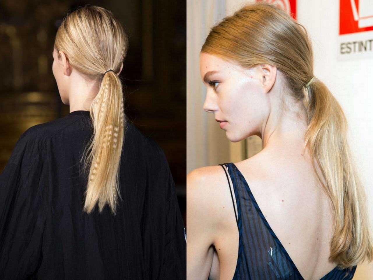 Гладкий хвост. Это, тот самый, редкий, в этом сезоне случай, когда прическа выглядит собрано и гладко. Хвост может располагаться высоко, почти на макушке или на затылке. Такой вариант хорошо подойдет под платье с декольтированной спиной. Низкий хвост идеально дополнит платье в бельевом стиле на тонких бретелях. Резинку можно обернуть прядью, или лентой в тон наряда.