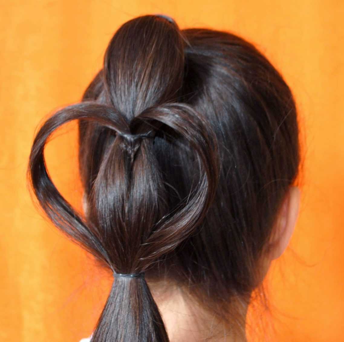 Вот такой замысловатый узор-сердце у вас получится при помощи обычных резинок. Если сделать декорацию укладки яркими резинками или заколками-цветами, то прическа станет ещё лучше.