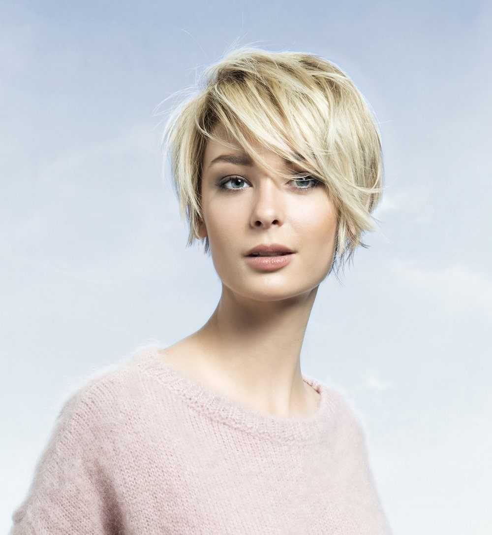 Круглый тип лица Подходит вариант с удлиненными прядями спереди. Длина их не должна быть ниже линии подбородка. Макушечная часть делается объемной, челка косая или удлиненная.