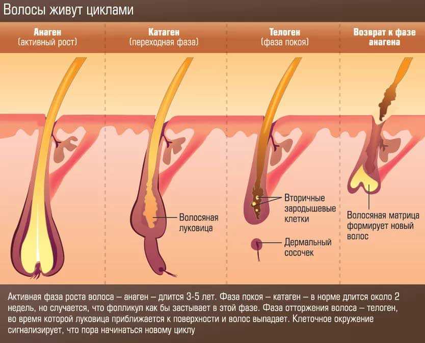 За полную жизнь волос проходит три основные фазы: анаген, катаген и телоген. Продолжительность различных стадий роста волос на голове у мужчин и у женщин в среднем одинакова.
