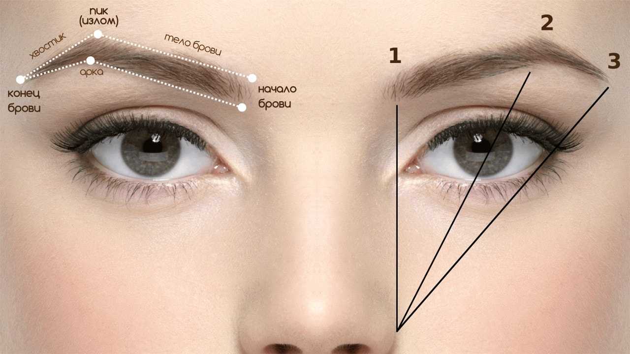 Нестареющая классическая формула за точку отсчёта принимает ту же боковинку кончика носа. И правильную форму бровей задаёт схема, указанная на рисунке: