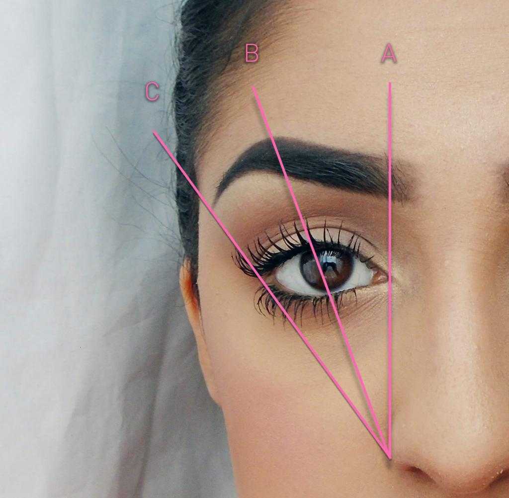 - Сделайте карандашом два штриха: там, где у вас будет начинаться бровь (над переносицей), и её окончание (для её определения нужно провести прямую линию от ноздри к виску через внешний уголок глаза).