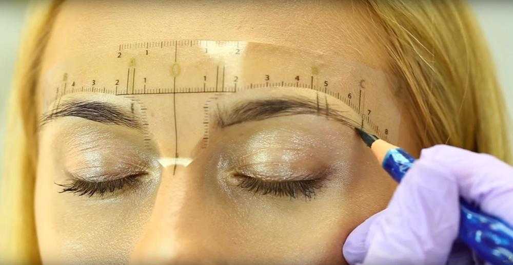 До начала всех работ, косметолог намечает сверху линейки естественное направление роста стержней. После этого, проводится обсуждение с клиенткой, касающееся выбора идеального контура. Только потом начинается прорисовка нового трафарета.