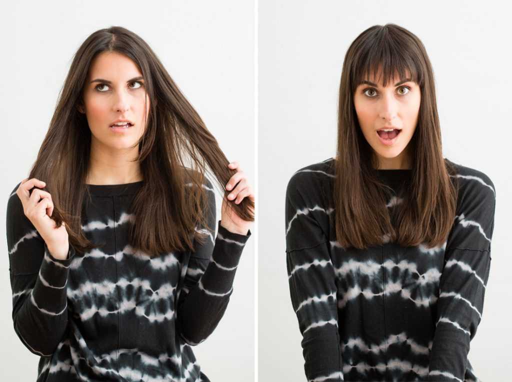 Если делать челку самостоятельно на мокрых волосах да еще и сильно натягивать пряди, результат получится на несколько сантиметров короче ожидаемого.