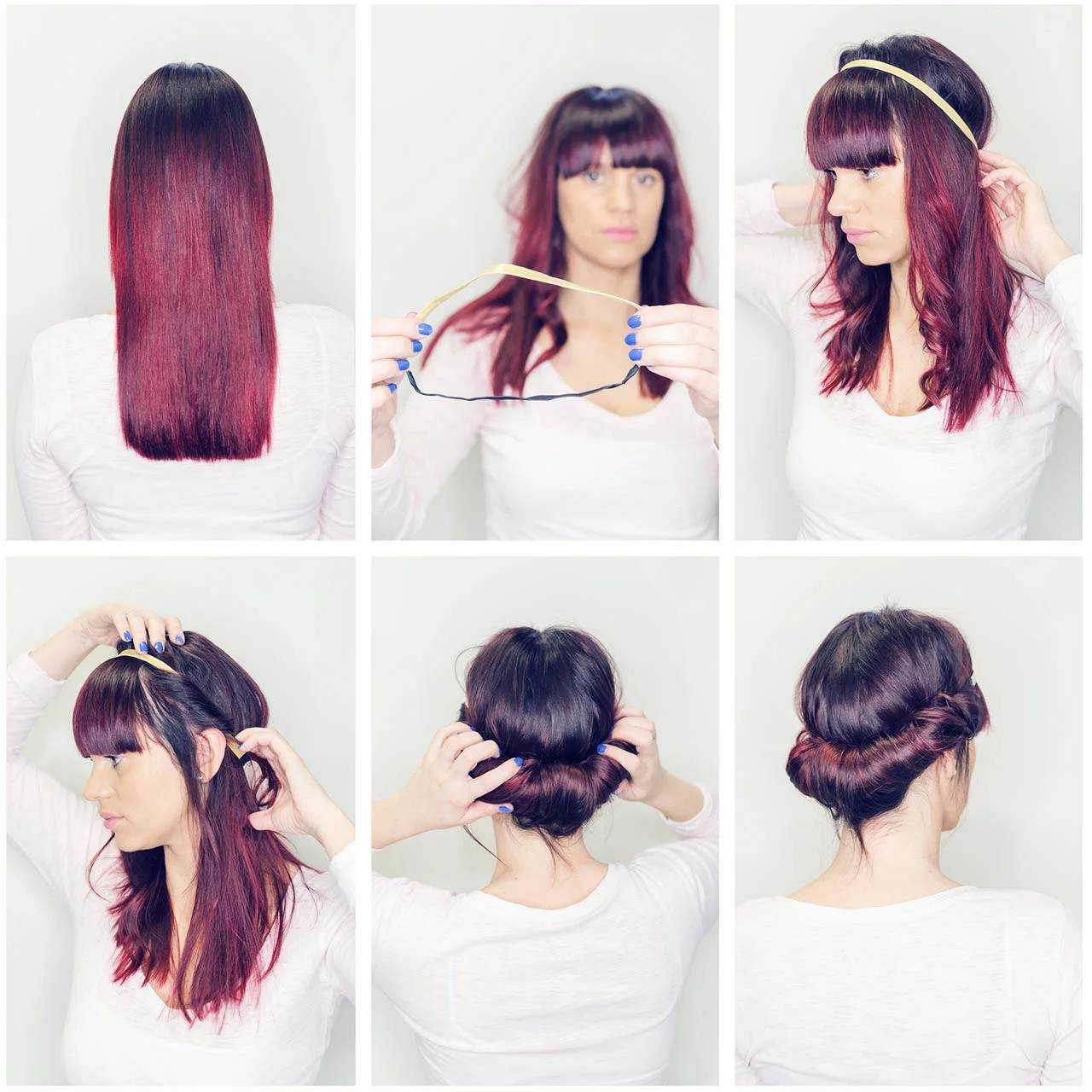 - Оберните волосы вокруг ободка, начиная с места за правым ухом, — должен получиться объемный низкий пучок, красиво окаймляющий весь затылок.