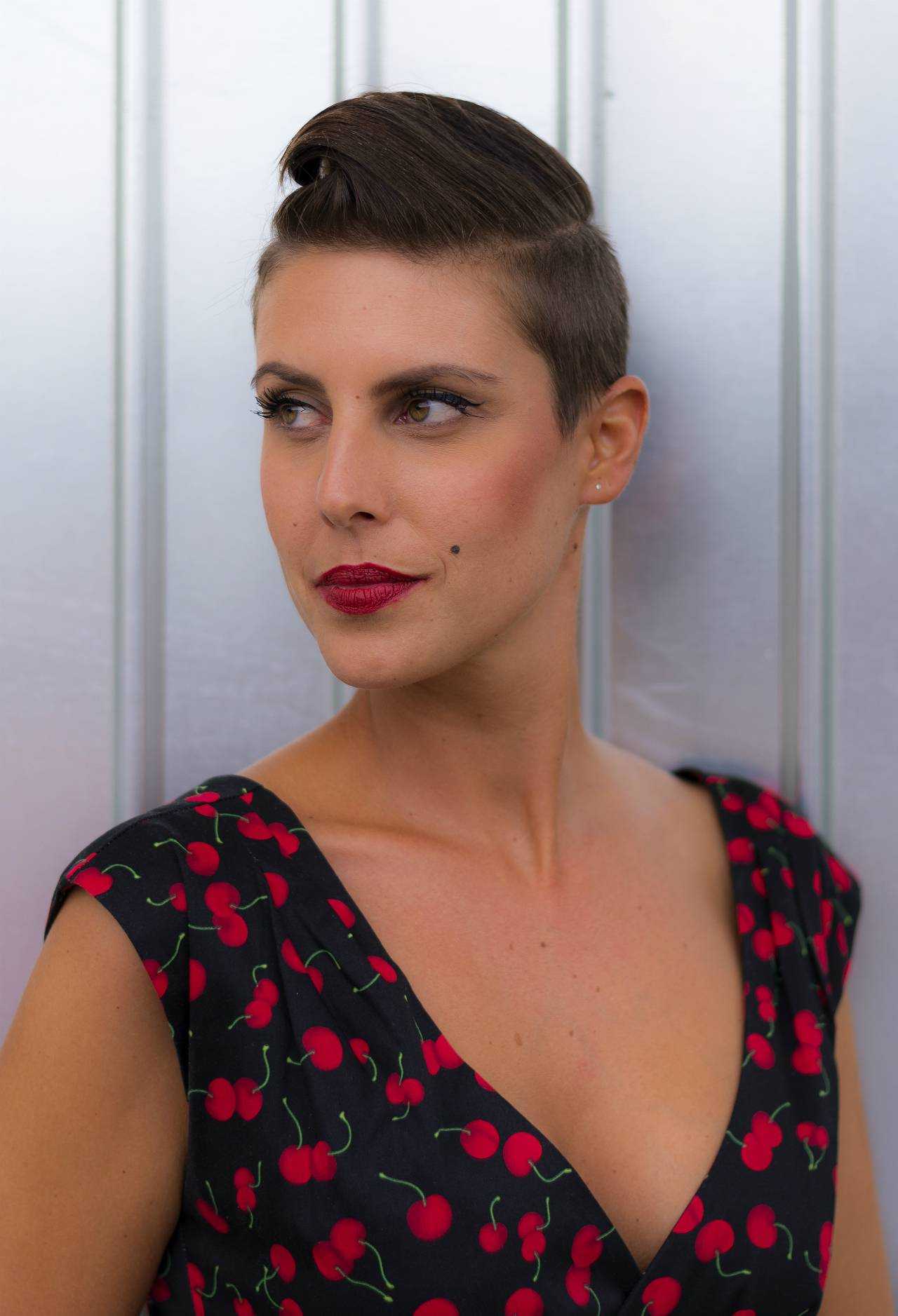 Короткая стрижка в сочетании с длинной челкой — прекрасная база для укладки как у стиляг. Закрутите челку в классическую трубу, зафиксируйте лаком, и эффектный образ готов.