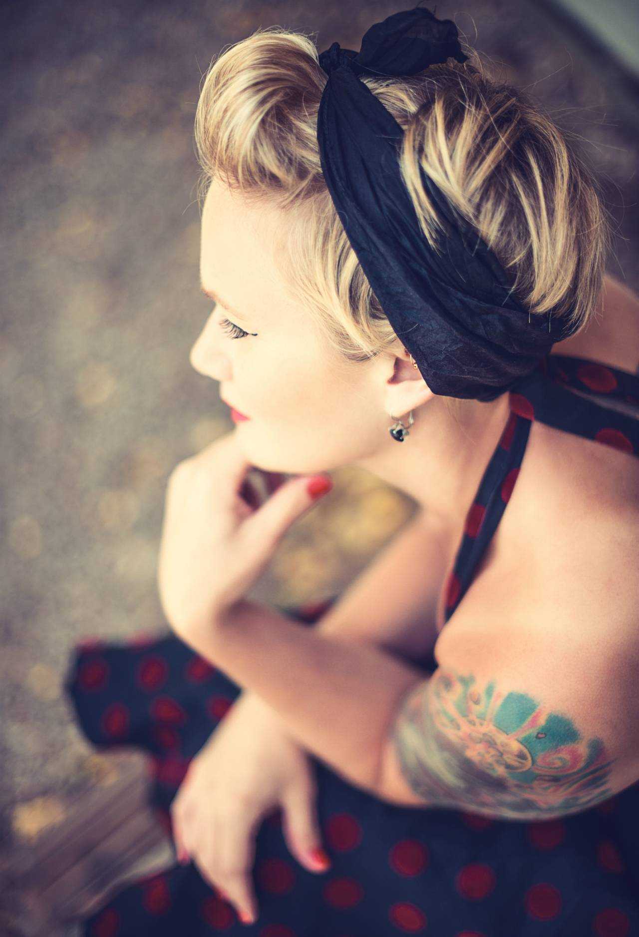 На фото – варианты причесок для женщин в стиле стиляги на средние волосы с двумя валиками на темени и яркой лентой, это простое, но очень смелое и колоритное решение: