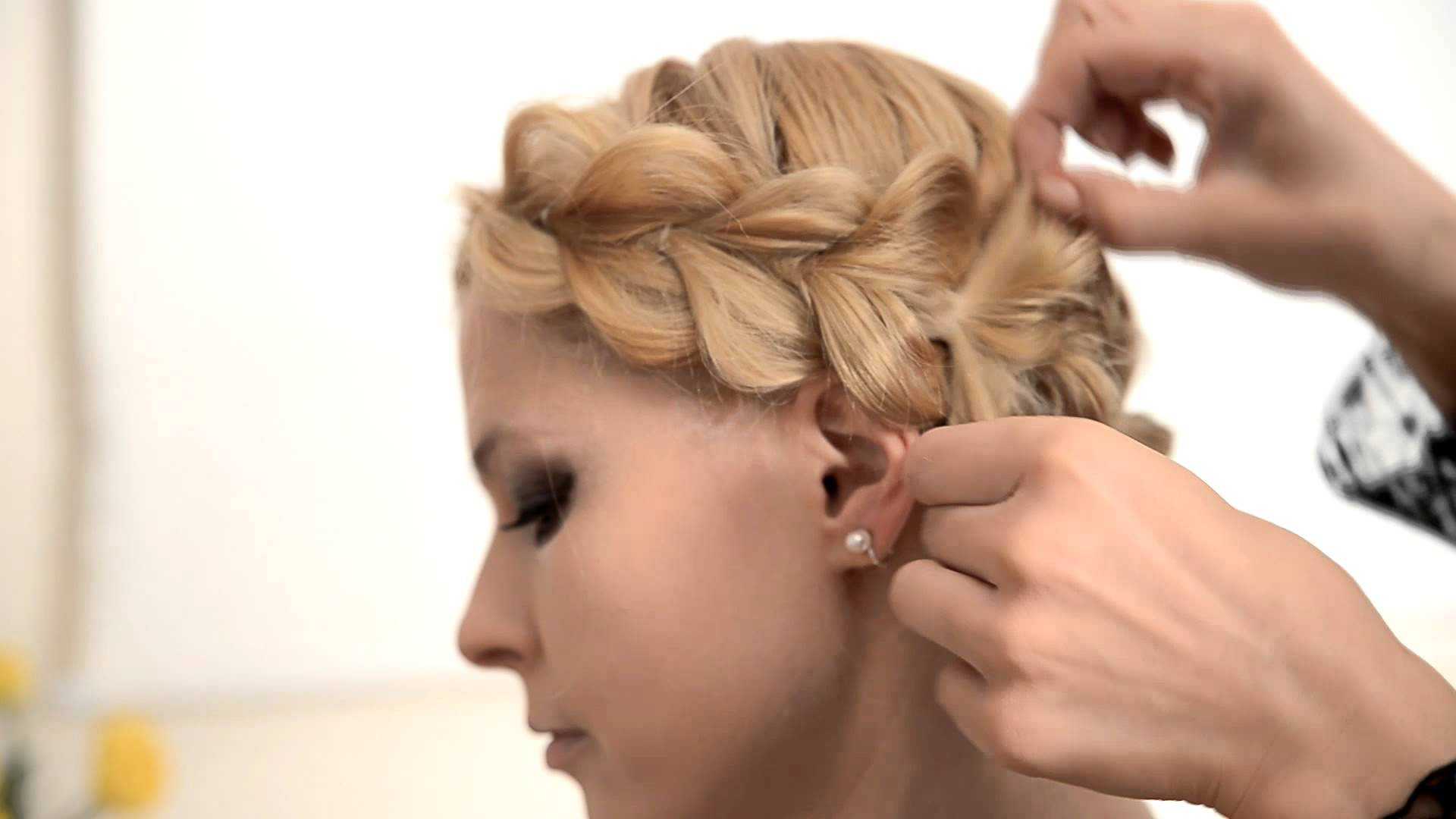Можно начать, сместив центр укладки в сторону. Выполнить обычную косичку из двух прядей с подхватами, располагая ее с одной стороны головы и постепенно смещая в другую. Закончив прихваты, продолжить плетение из двух прядей, затем закрепить.