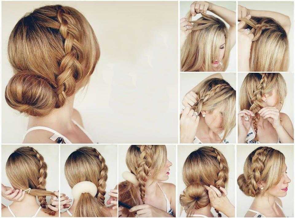 Торжественный пучок с помощью носка или пончика можно сделать при помощи кос. Нужно лишь знать, как сделать бублик для волос, иметь 15 минут свободного времени.