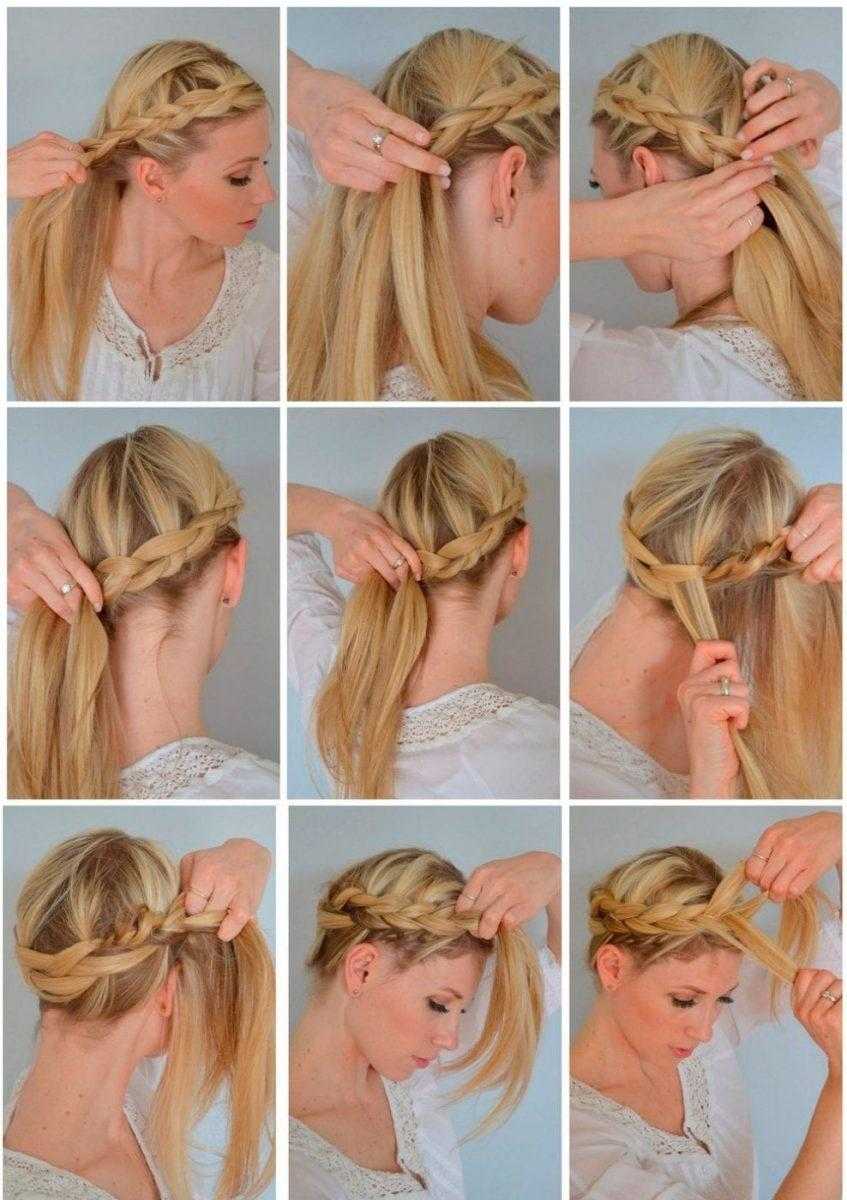 Неширокую трехпрядную косичку заплетают у затылка либо возле виска, оборачивают ею голову надо лбом, направляют к противоположному уху, фиксируют в нескольких местах невидимками.