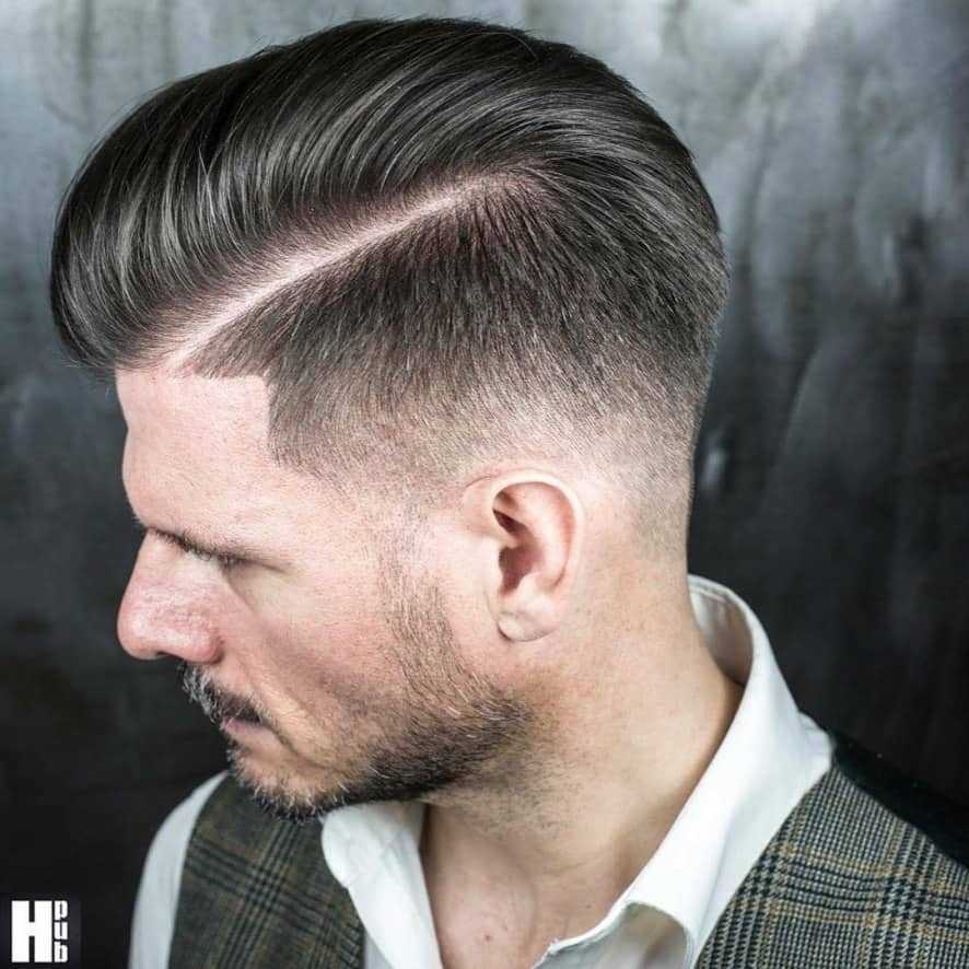 С пробором. Верхняя часть прически сохраняет длину не более 5 сантиметров, поскольку более длинный вариант ухудшает пропорции и уменьшает опрятность, делает образ неаккуратным. Зачес делается на бок и закрепляется укладочными средствами. Сам пробор добавляет солидности. Стрижка выигрышно смотрится на молодых людях, носящих бороду. В процессе работы над волосами мастер также оформляет и ее.