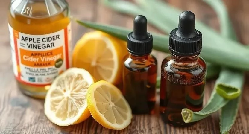 - Яблочный уксус: разведите яблочный уксус с водой в соотношении 1:1, нанесите на кожу головы на 15-20 минут, затем смойте.
