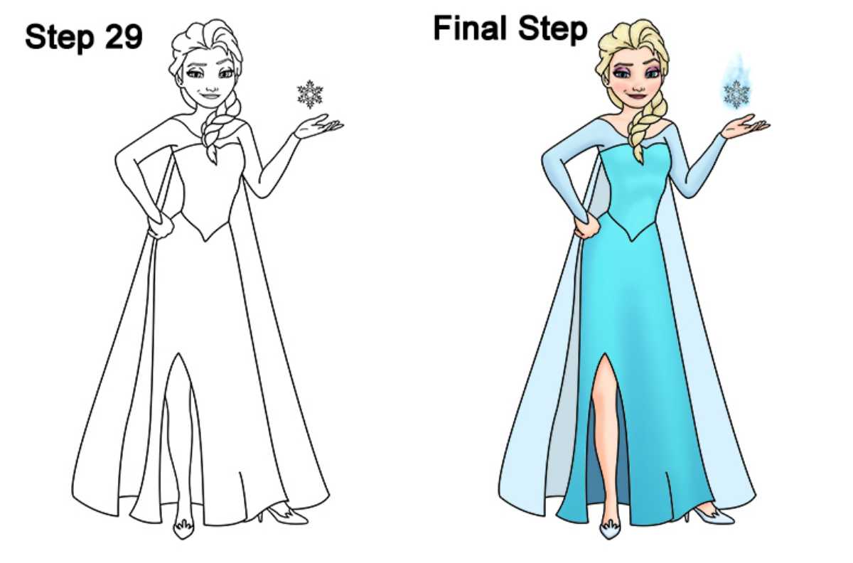 Девочки и девушки по десятому разу пересматривают мультики о приключениях сестер Эльзы и Анны, покупают кукол и фигурки в виде любимых героинь, носят прически, как у них. Ничего удивительного не будет в том, если однажды девочка захочет нарисовать Королеву Эльзу в роскошном платье в ее ледяном дворце.