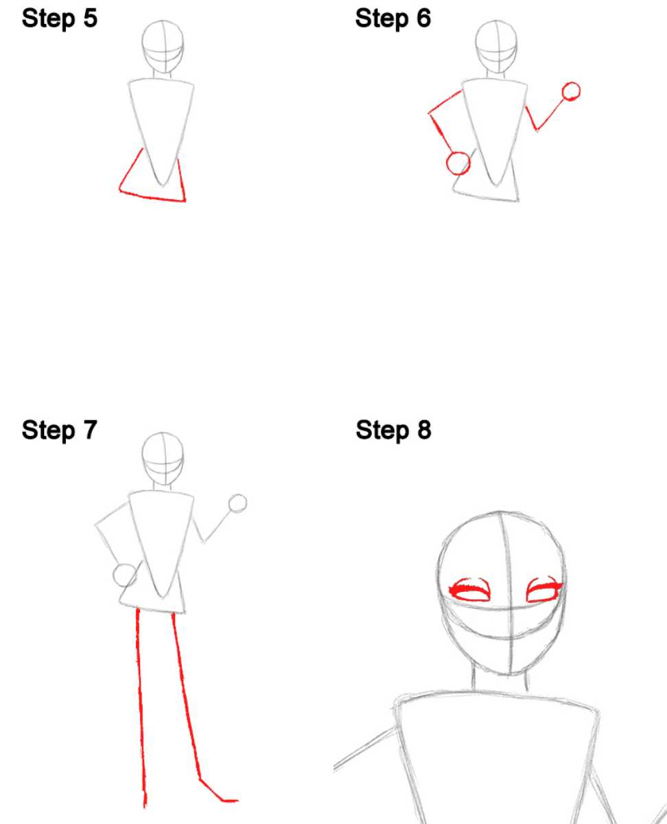 - Бедра у мультяшной героини узкие, их намечают треугольником и делают приблизительно равными ее плечам.