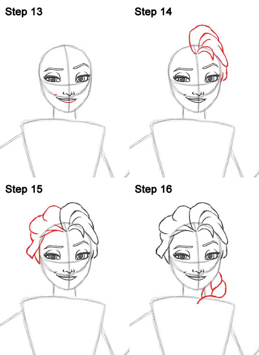 - Мультипликаторы студии Дисней перебрали сотни вариантов прически для Эльзы, в конце концов, остановившись на объемной косичке. Рисовать ее начинают сверху.