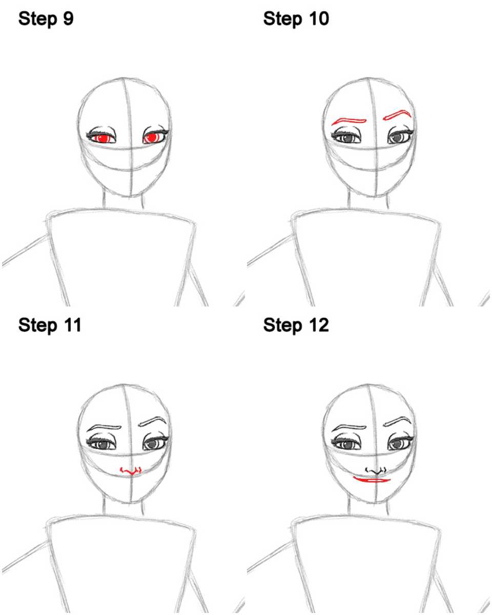 Шаг 3 Начинаем рисовать лицо, я всегда сначала рисую нос, а потом уже глаза и рот. И так рисуем нос и губы. Для губ я делаю 2 овала сверху и 2 овала снизу, затем по этим овалам строим губы.