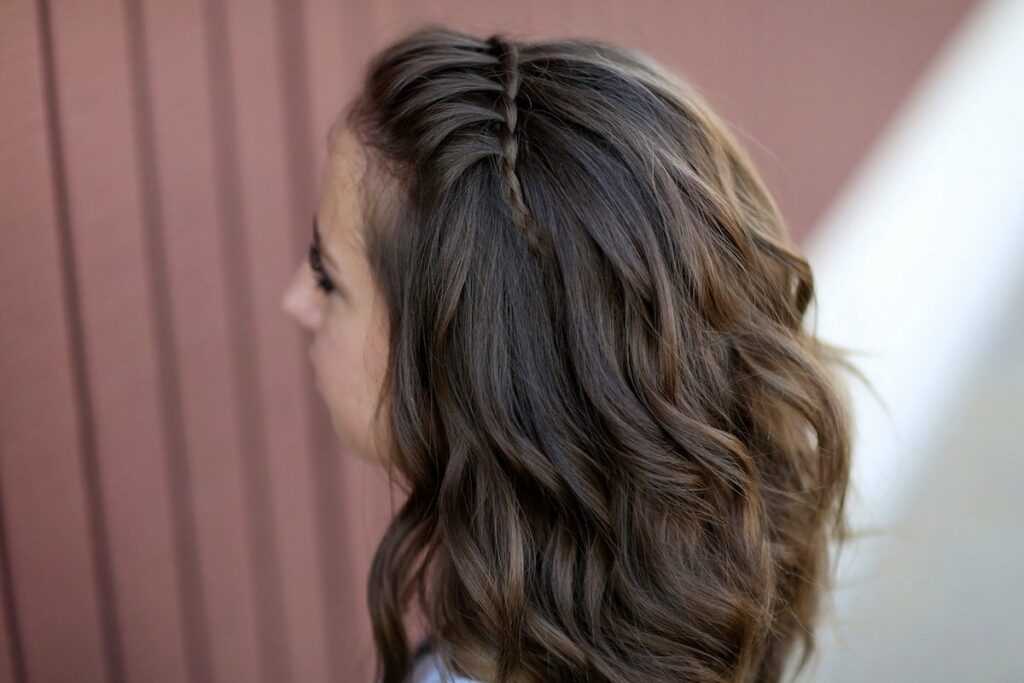Простая французская коса лежит в основе этой незамысловатой прически. Техника плетения заключается в том, что прядь, которая находится снизу, выпускается. Вместо нее берется локон из свободных волос и вплетается снова. Косичка идет от виска до виска, немного спускаясь к затылку. Пройдя через середину, необходимо снова подниматься к правому уху, чтобы создать эффект бурлящих волн из волос.