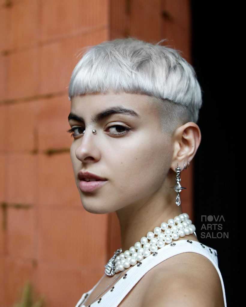 Горячим трендом в женских стрижках нового сезона стала и небезызвестная «шапочка» на короткие волосы. Новизна стрижки заключается в сбривании височной и затылочной части головы, оставляя аккуратную шапочку сверху.