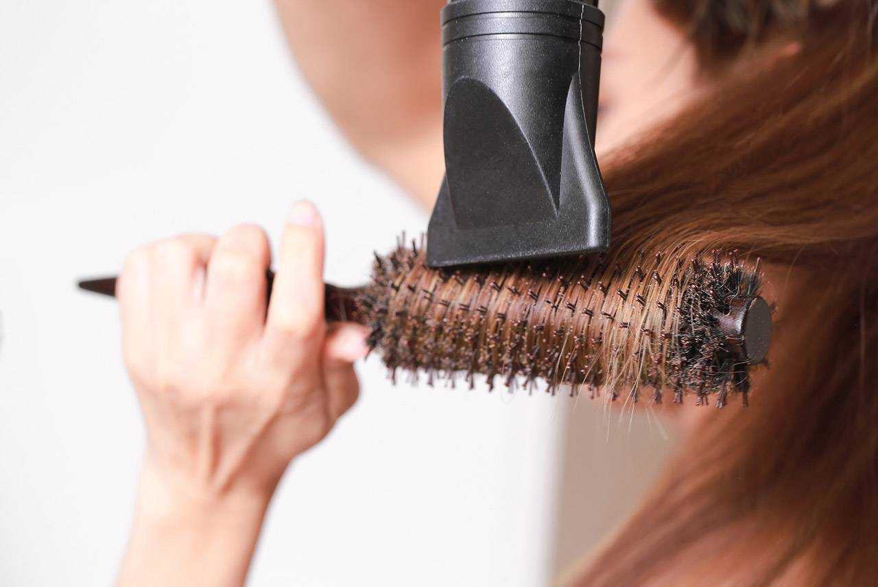 - Поместите брашинг у основания пряди и прокрутите его к низу локона, одновременно просушивая волосы горячим феном.
