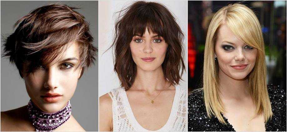 | Треугольник | Лоб и скулы широкие, подбородок узкий | Объемные, с закругленными к подбородку прядями, широкие, густые, ассиметричные и прямые челки |