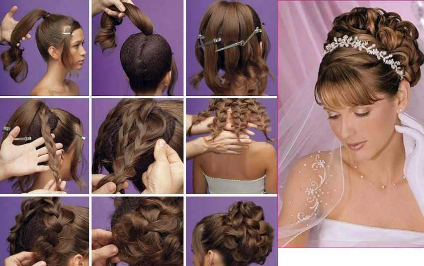 - Для завершения прически прикрепите фату под собранными волосами, а спереди украсьте волосы ободком или диадемой.