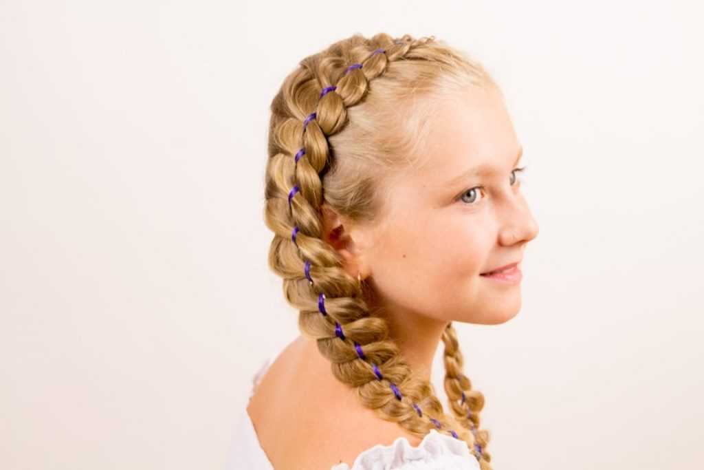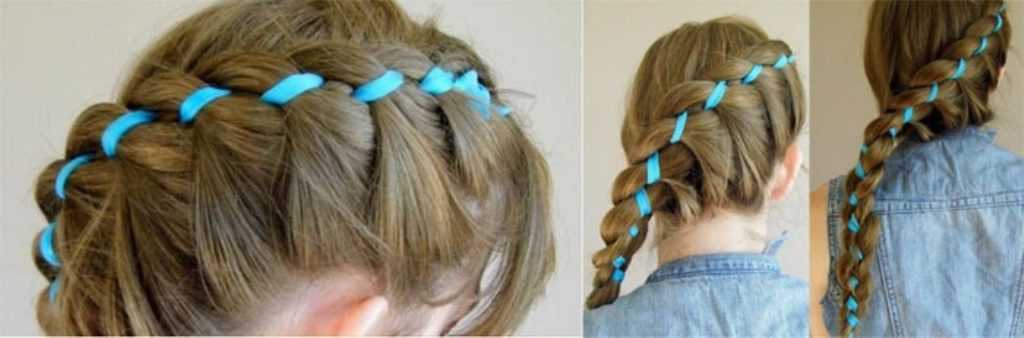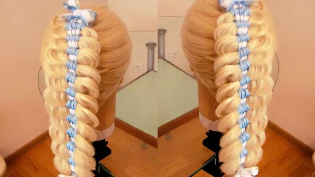 Чтобы сделать такую укладку еще более стильной, в плетение следует добавить яркие атласные ленты