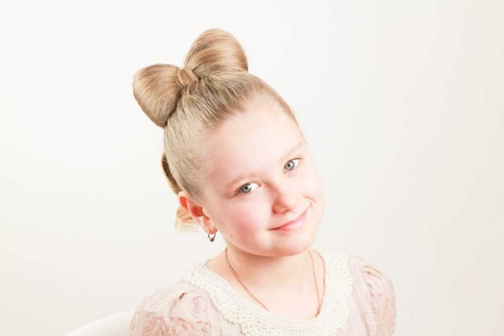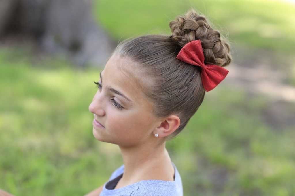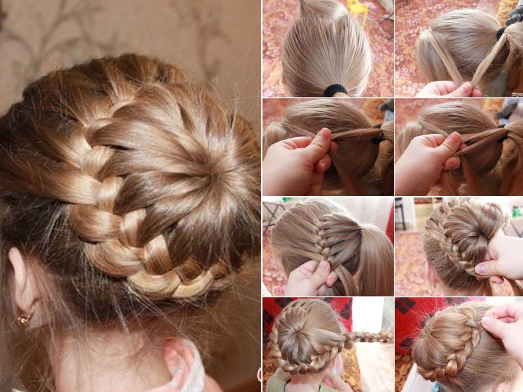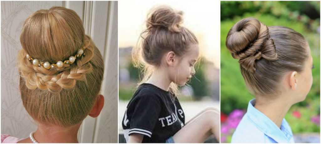 Эта прическа подойдет для волос средней и большой длины. Для нее нужно подготовить две резинки и валик для объема. Сначала волосы ребенка нужно собрать в высокий хвост. Чтобы волосики не выбивались, можно использовать любое укладочное средство. Хвост нужно завязать на резинку, лучше всего – прозрачную. На хвост следует надеть валик для объема и распределить по нему все волосы. Зафиксировать пучок можно с помощью второй резинки. Если волосы очень густые и длинные, то использовать валик для объема необязательно. А чтобы укладка стала более интересной, ее можно украсить аксессуарами – яркими заколками и цветами. Как делается такая прическа на 1 сентября, можно посмотреть на видео и фото.