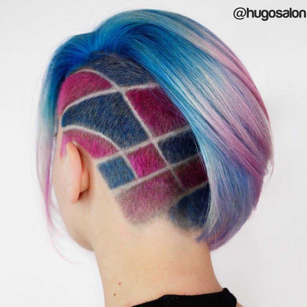 Looks so good, you wish you could eat it. The perfectly sweet pink and blue hues are offset by a cheeky checkered design. It’s an adventurous hair tattoo for a girl that wants to live out all of her Candyland dreams.