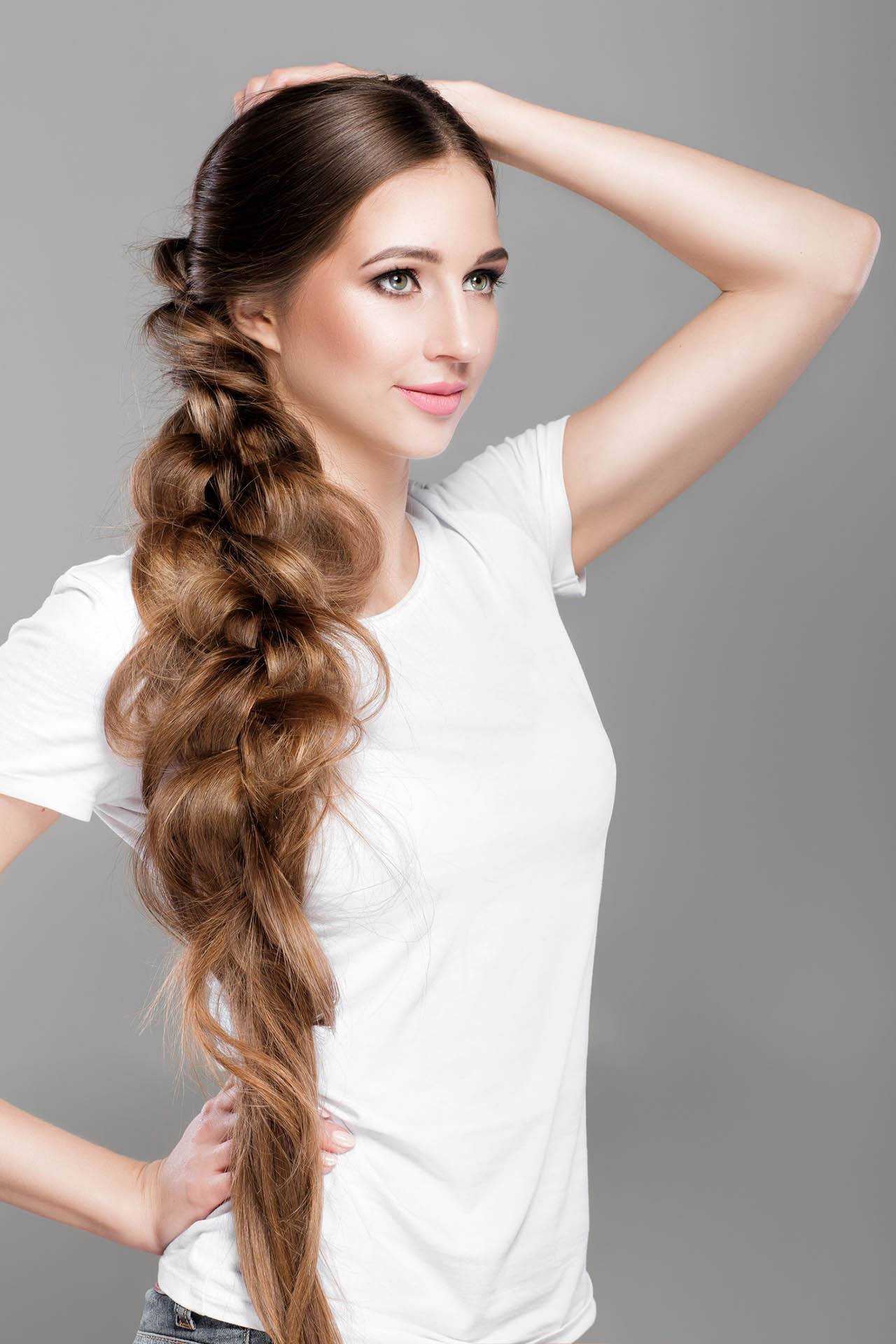 На длинных волосах хорошо смотрятся как варианты распущенных укладок, так и высоких. В обоих случаях можно внедрить плетение. Для высокой укладки запрокиньте голову вниз и начните плести колосок от затылка к макушке и оформите в пучок либо украсьте голову плетением в виде венка.