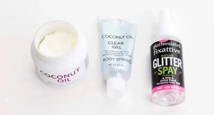 - Нанесите основу (кокосовое масло, гель или крем) на участки тела, которые хотите покрыть блестками.