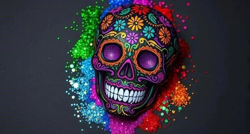 Блестки часто используются в мексиканском гриме, особенно при создании образа «Калавера» (череп). Особенности нанесения блесток в этом случае заключаются в создании сложных узоров и рисунков на лице и теле. Техники включают использование трафаретов, кистей разной толщины и кремовых основ. Примеры рисунков: изображение черепа, цветочные мотивы, геометрические узоры. Сочетание блесток с другими элементами грима, такими как черные и белые краски, создает эффектный и запоминающийся образ.