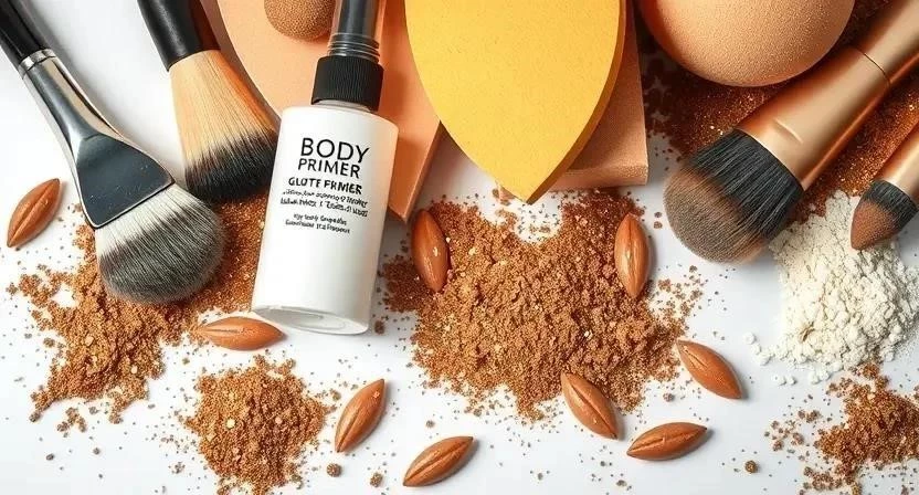 - Нанесите праймер для тела на участки, где планируете использовать блестки. Праймер создаст липкий слой, который удержит блестки на коже.